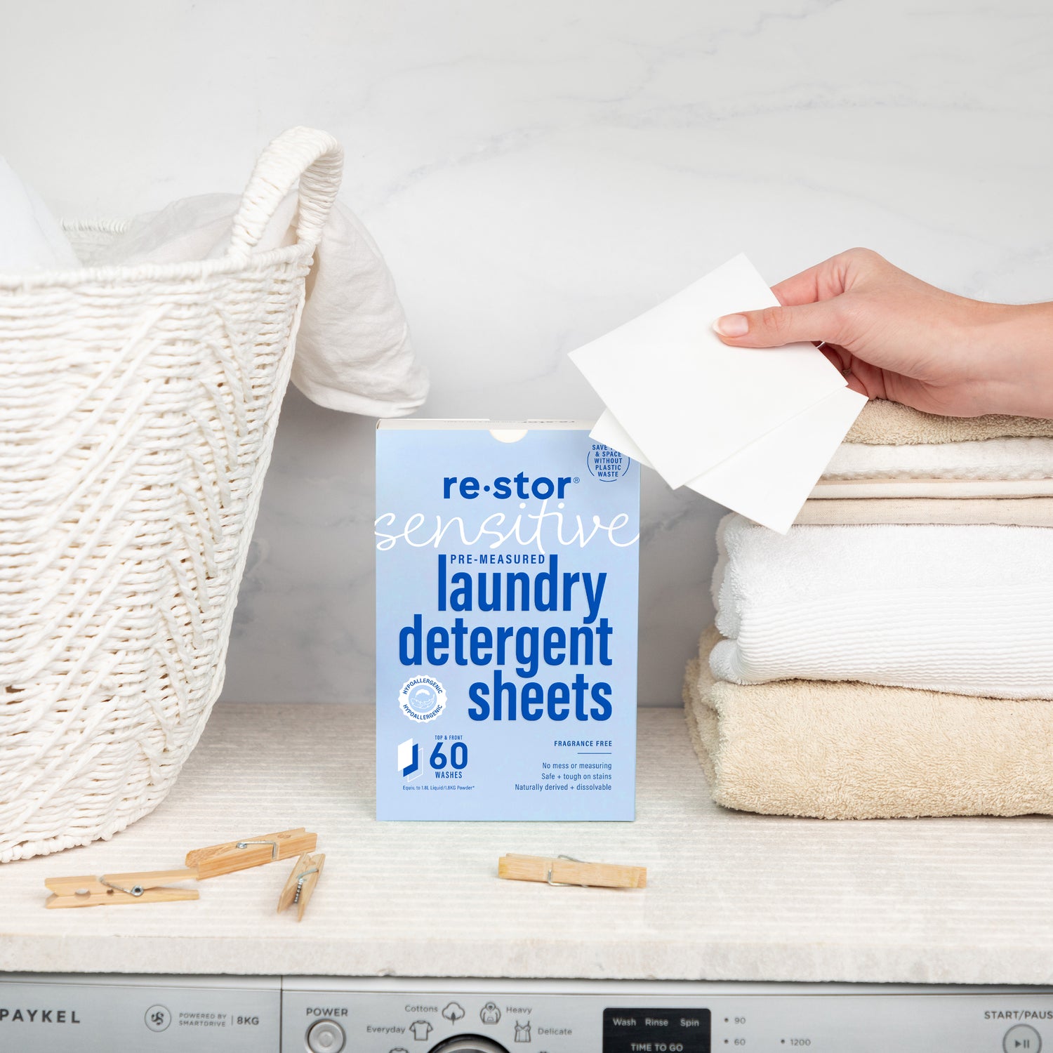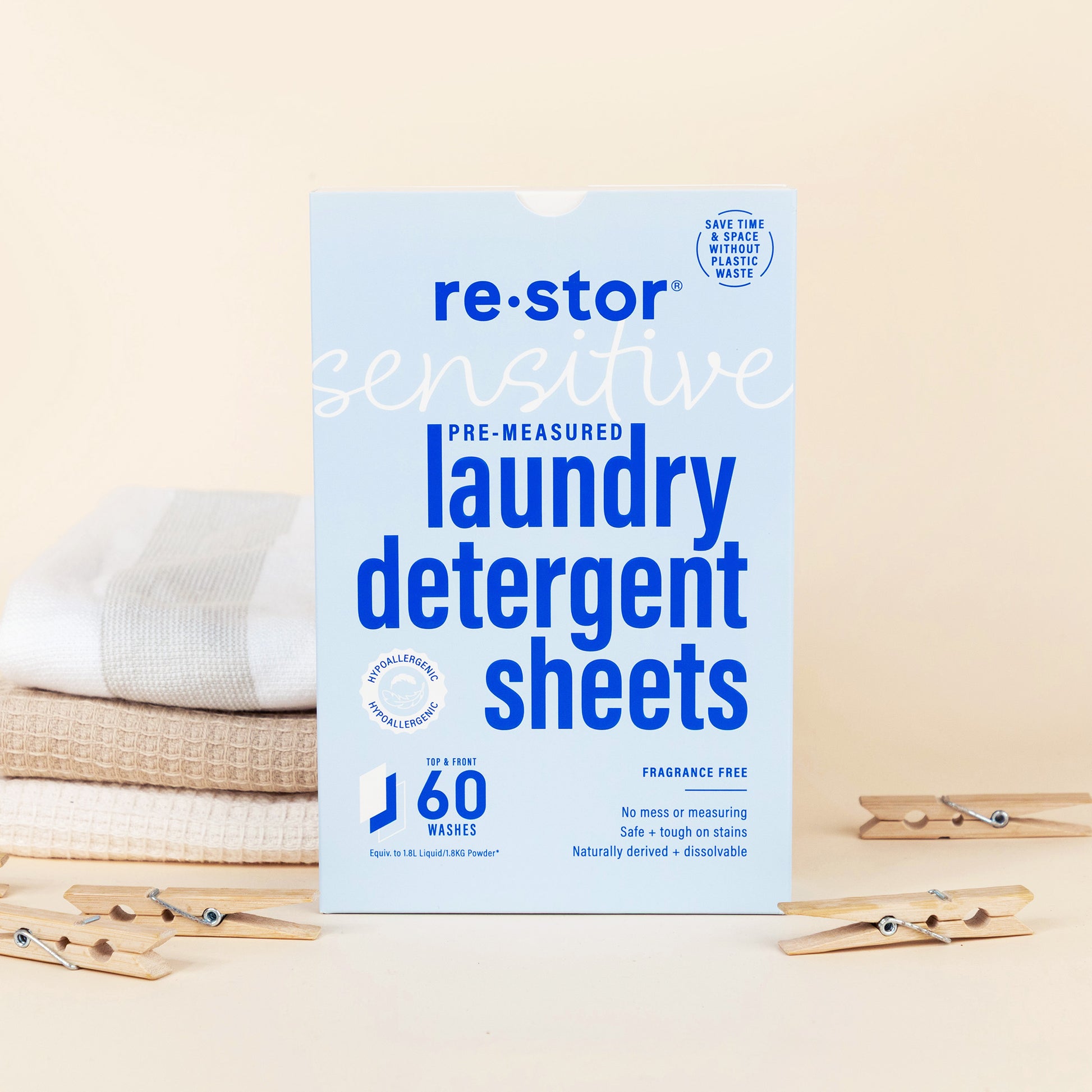 Hypo-allergenic, fragrance-free, ultra-concentrated Restor Laundry Detergent Sheets that make washing a breeze without plastic waste.
